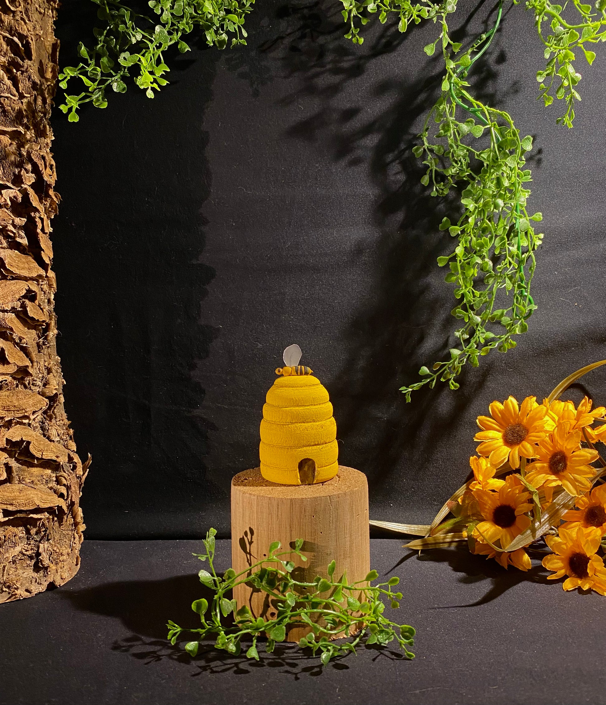 This Beehive and bee are locally sourced Basswood and the bee wings are made out of plastic. The bee hive is spun on a wood lathe and the bee is hand carved. The piece is painted with acrylic and stained with water base stain to preserve the piece.