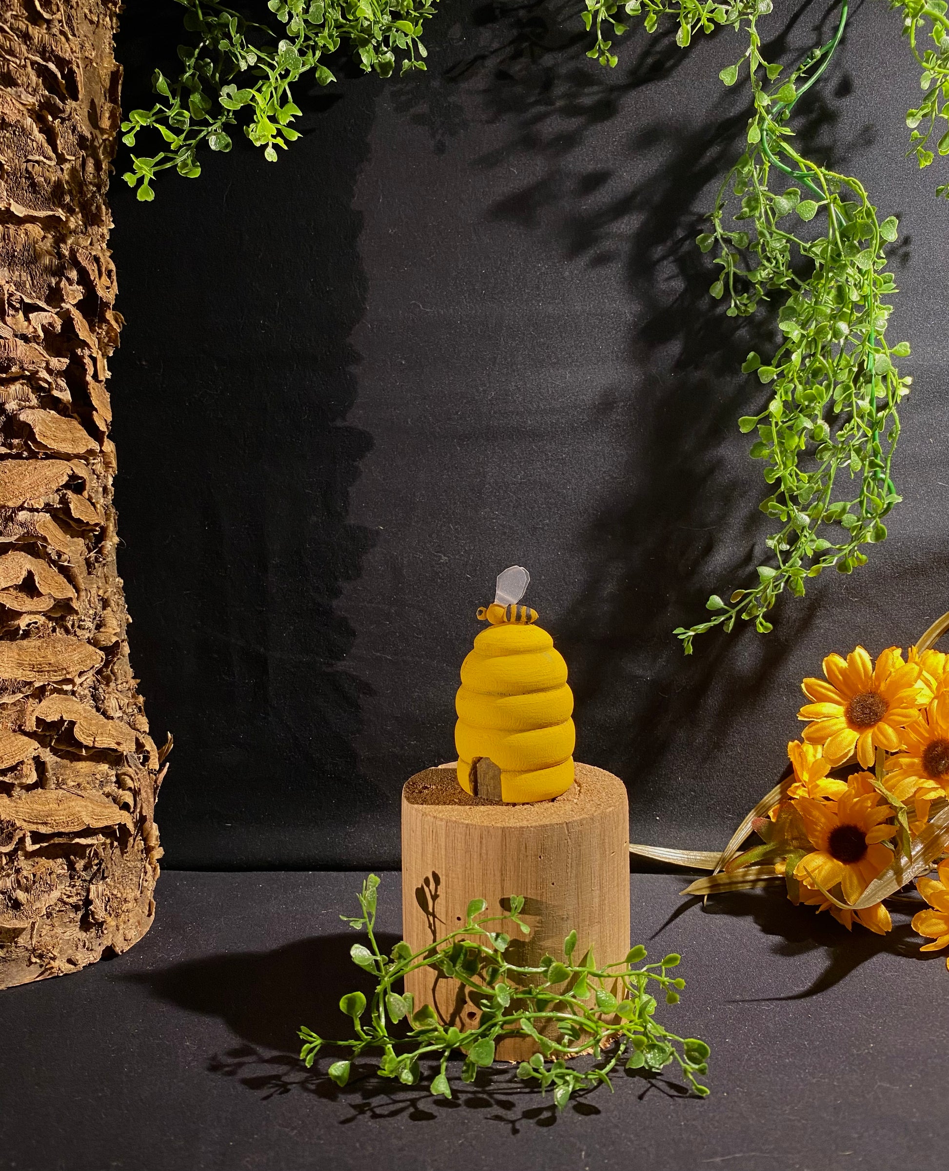 This Beehive and bee are locally sourced Basswood and the bee wings are made out of plastic. The bee hive is spun on a wood lathe and the bee is hand carved. The piece is painted with acrylic and stained with water base stain to preserve the piece.