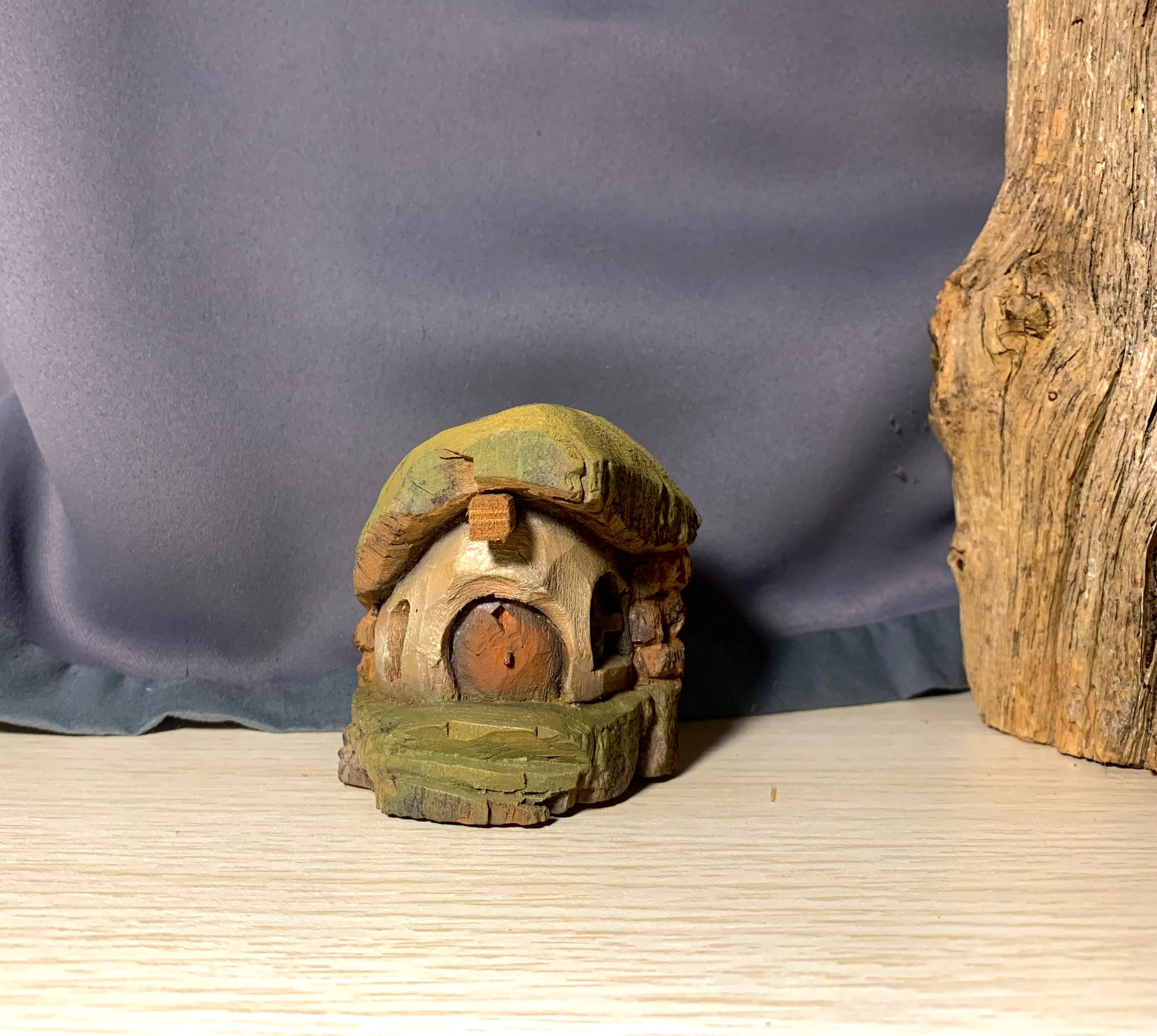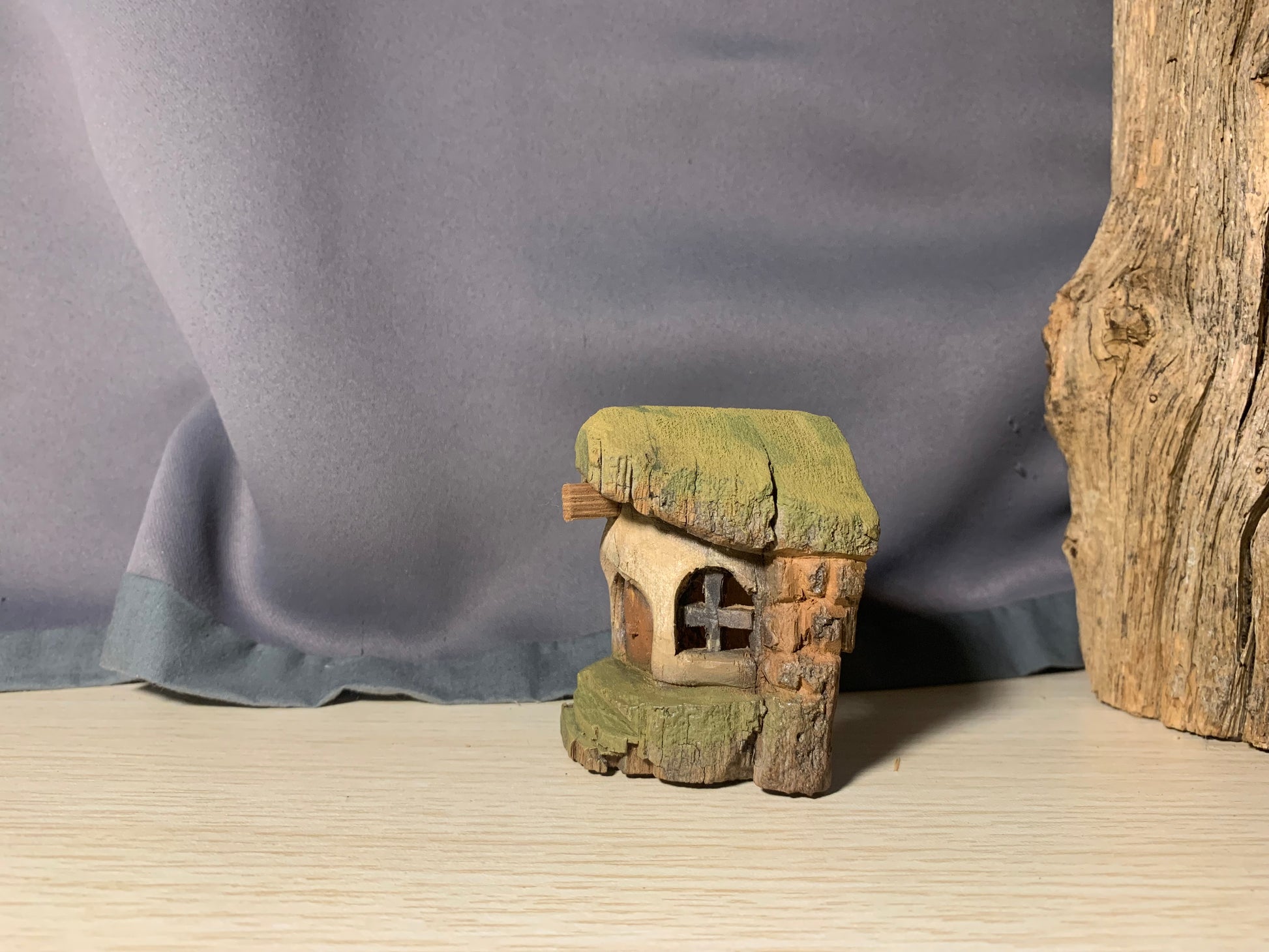 This hobbit house is made out of Eastern Cotton Wood Bark and lightly painted with acrylic paint and water-based stain.