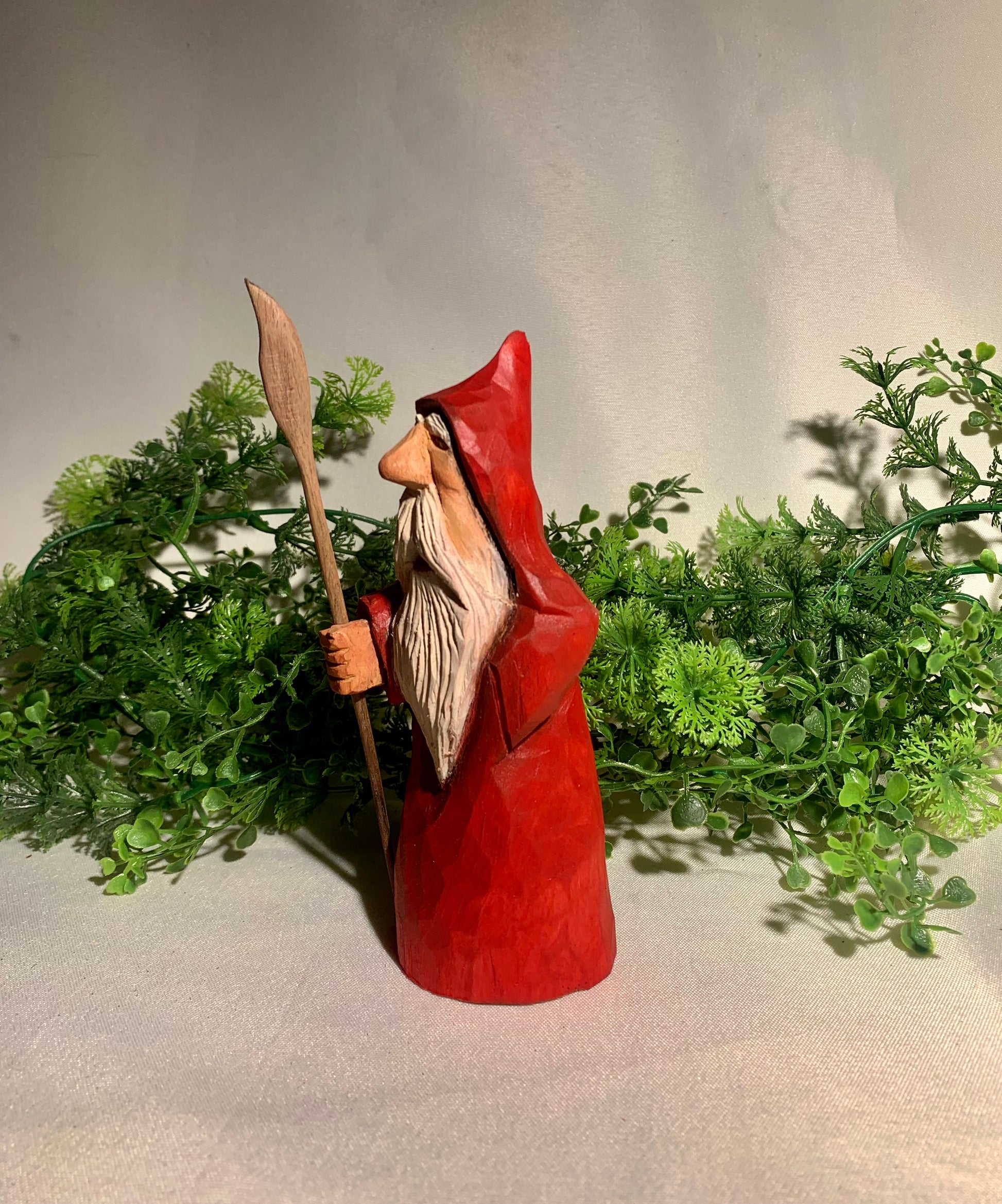 This Journeying Wizard and his staff are carved out of Basswood, coated in varnish and painted in acrylic paint. The staff is hand-carved and removable. We recommend removing the staff when transporting this item to ensure it doesn't break.
