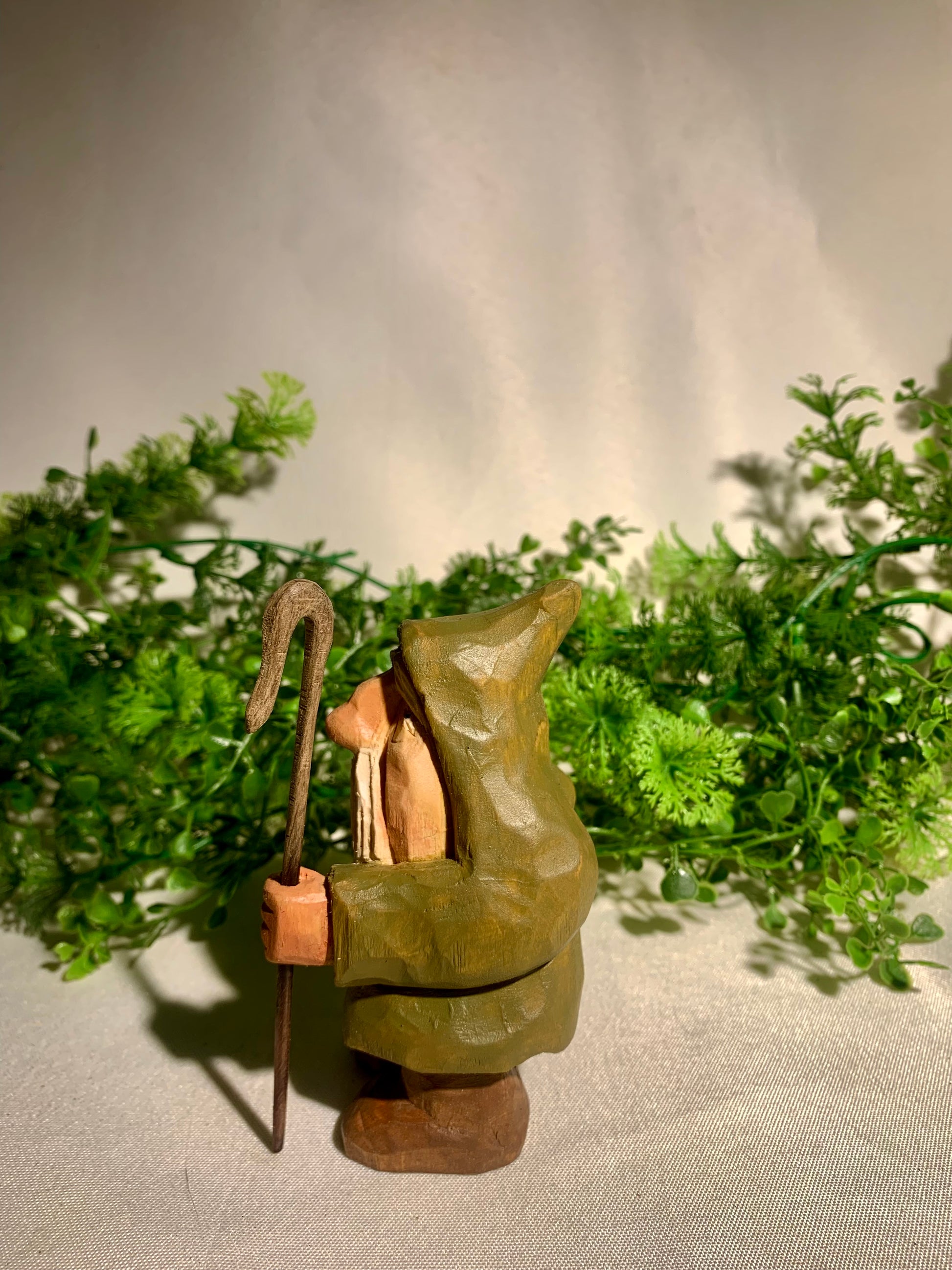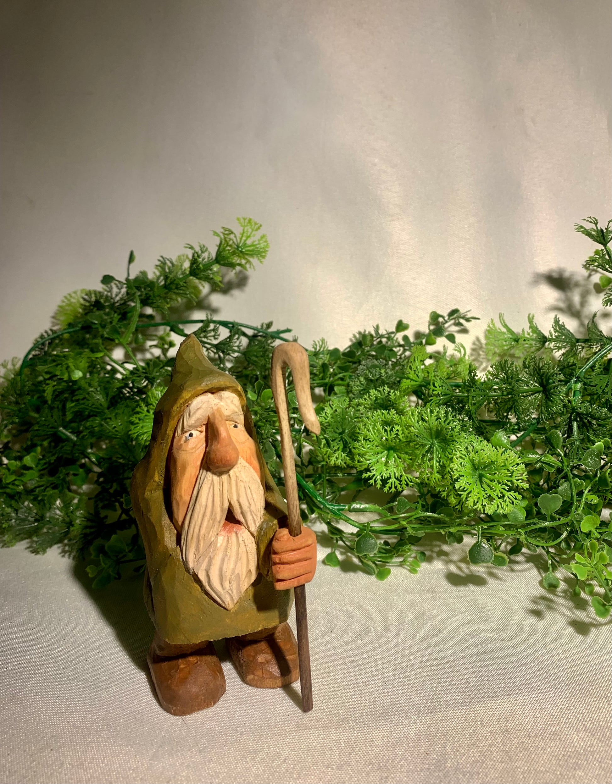 This Journeying Wizard and his staff are carved out of Basswood, coated in varnish and painted in acrylic paint. The staff is hand-carved and removable. We recommend removing the staff when transporting this item to ensure it doesn't break.