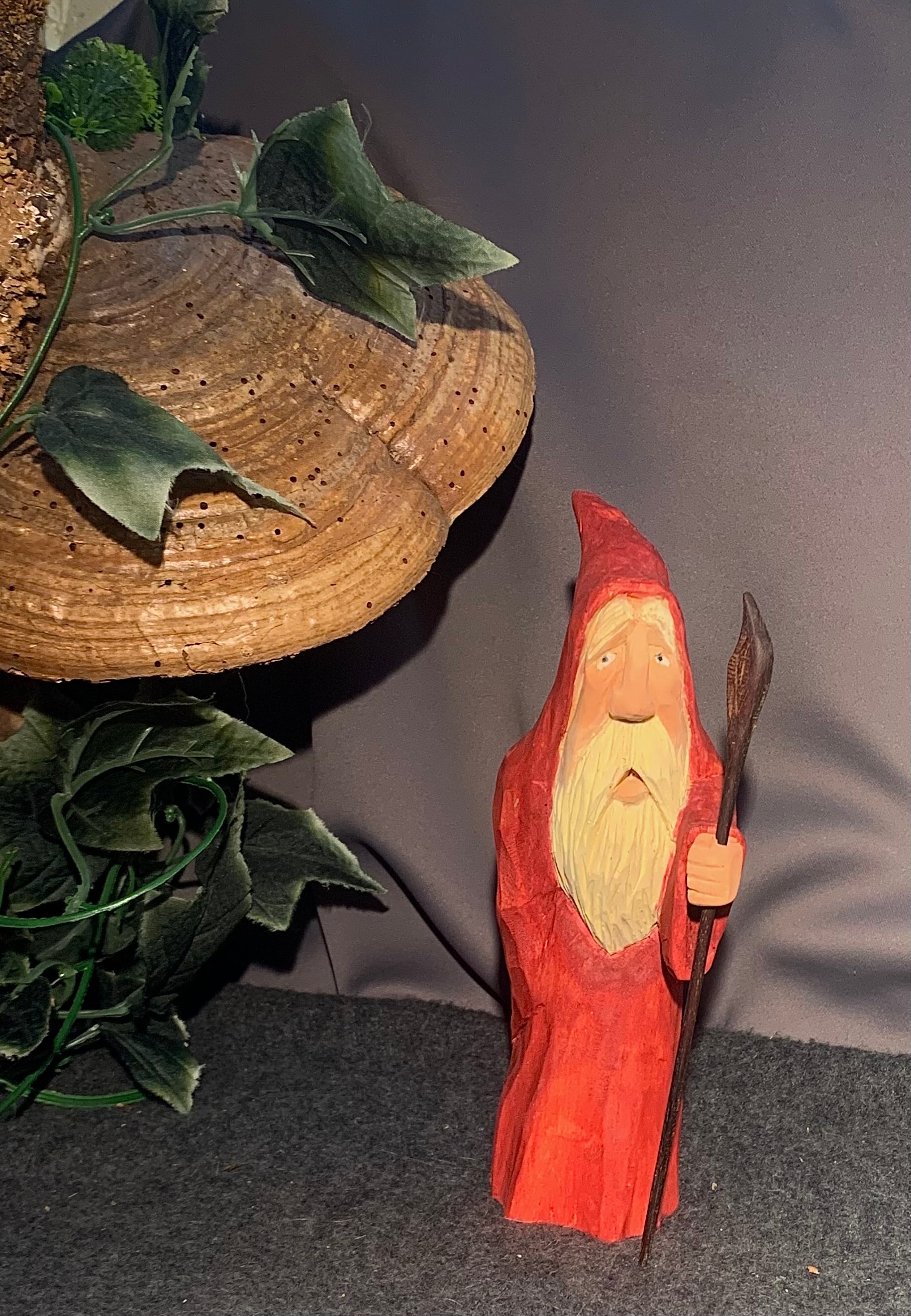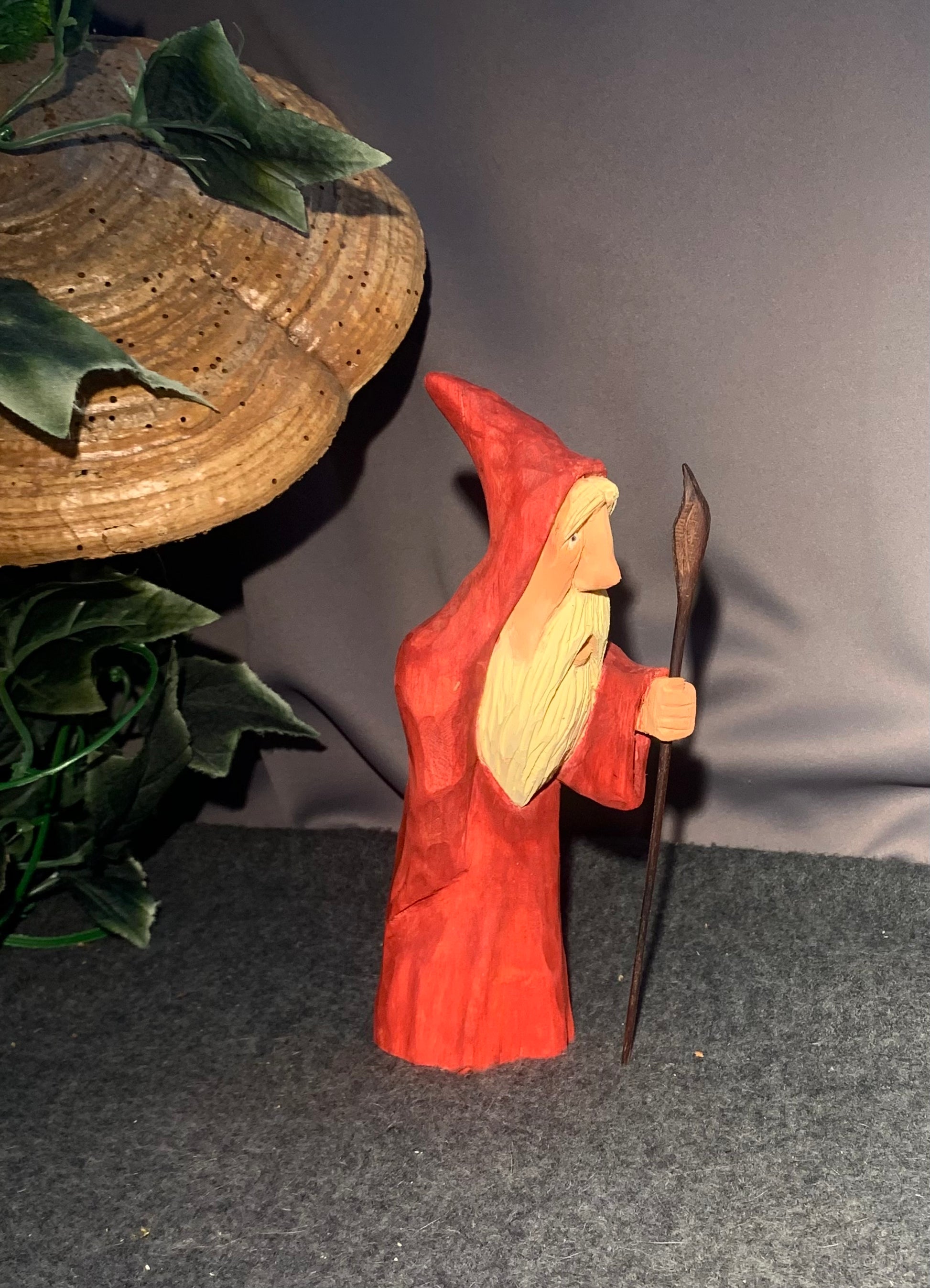This Journeying Wizard and his staff are carved out of Basswood, coated in varnish and painted in acrylic paint. The staff is hand-carved and removable. We recommend removing the staff when transporting this item to ensure it doesn't break.