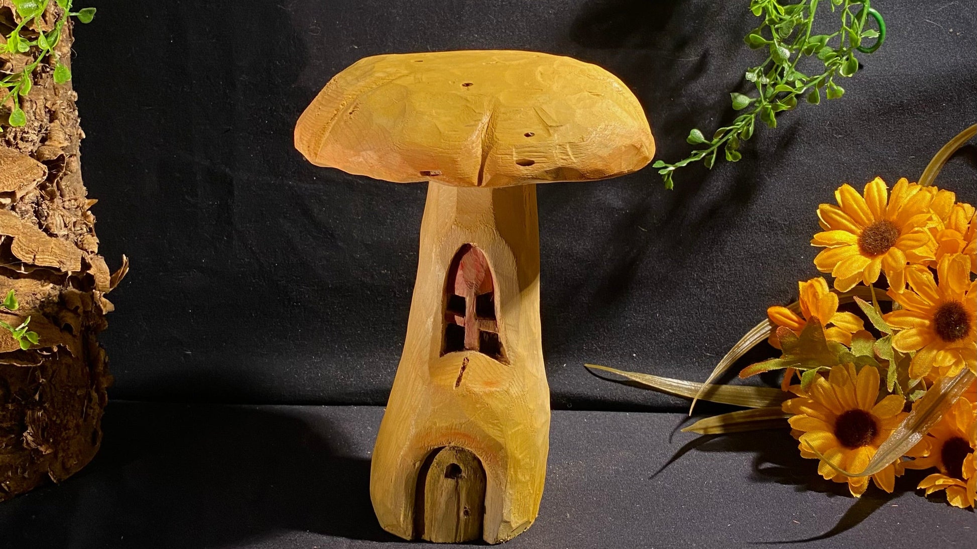 This Mushroom House is hand-carved from White Cedar, stained in urethane and painted in a light acrylic paint wash.