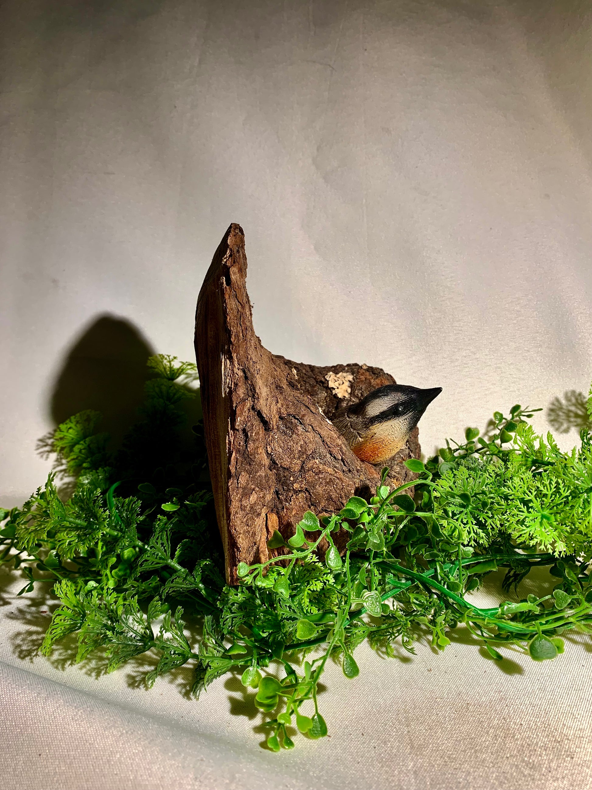 This little Nuthatch is carved from basswood, painted with acrylic paint and coated with water-based varnish. The wood it sits on is maple wood and the knot it sits in occurred naturally within the tree.