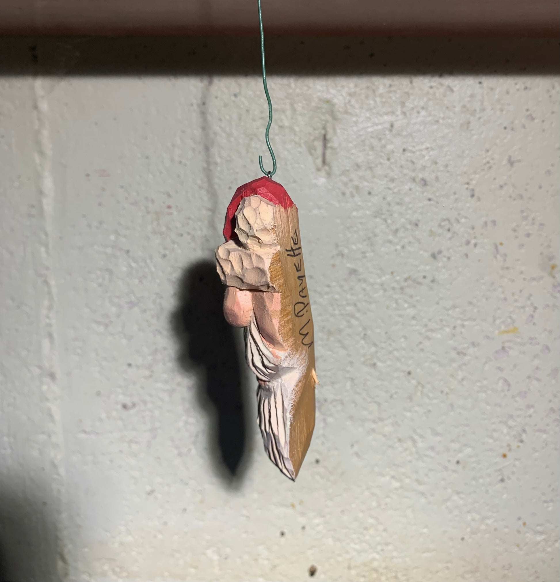 This Santa Ornament is carved from Basswood, painted in acrylic paint and lightly stained with water-based stain in order to preserve the piece.