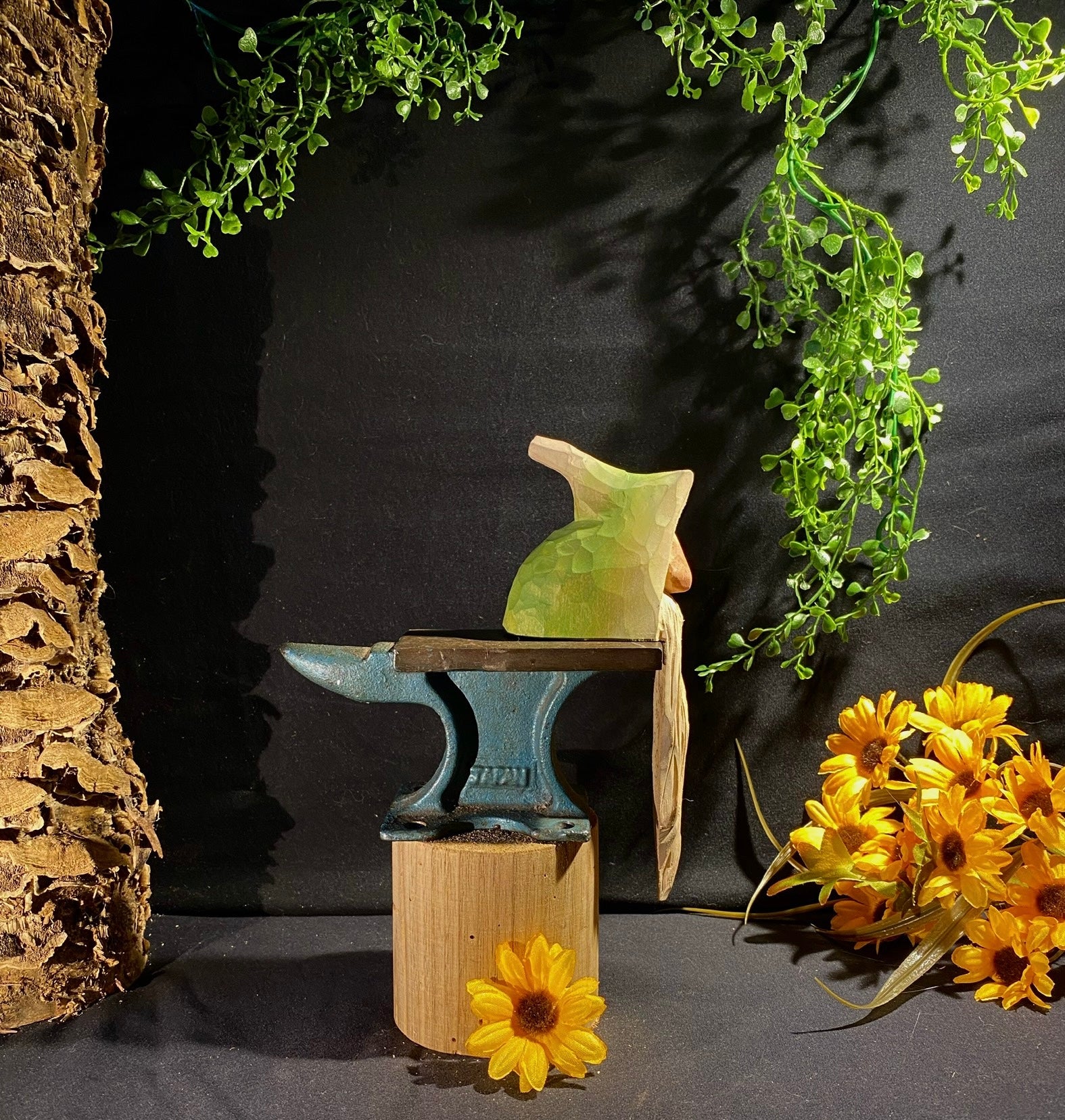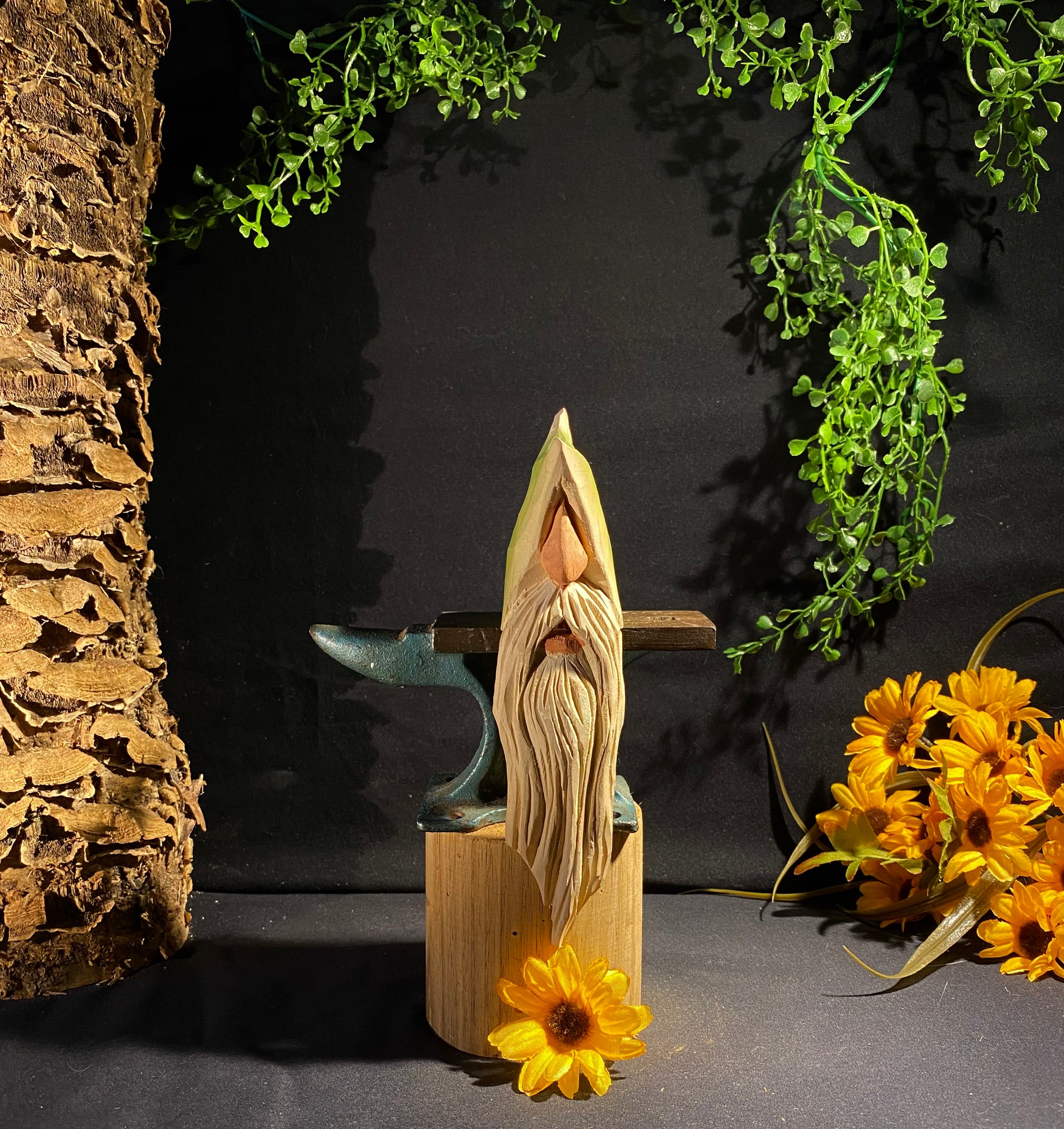 This shelf elf is hand-carved Basswood, stained in water base stain and painted with acrylic paint.