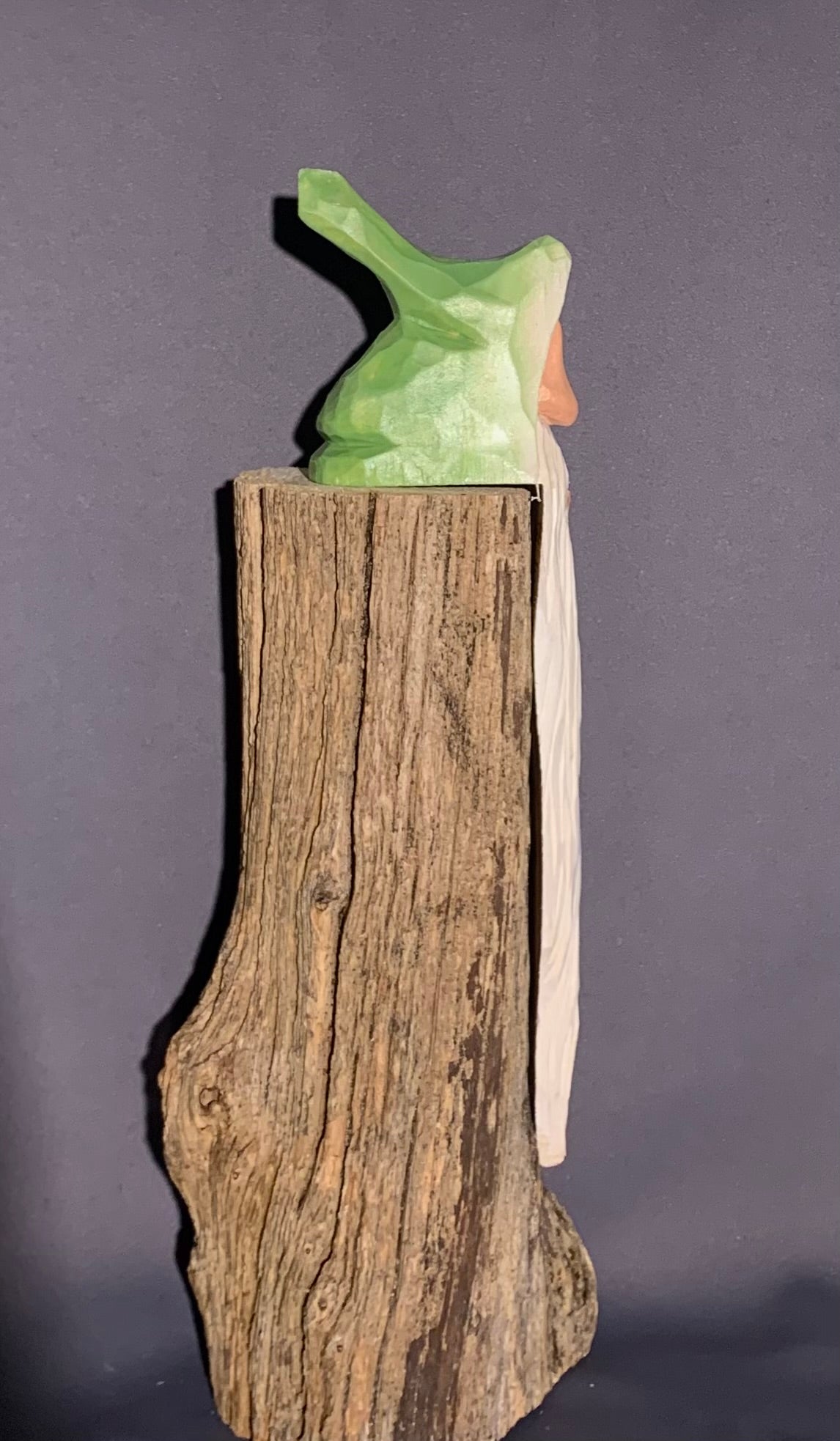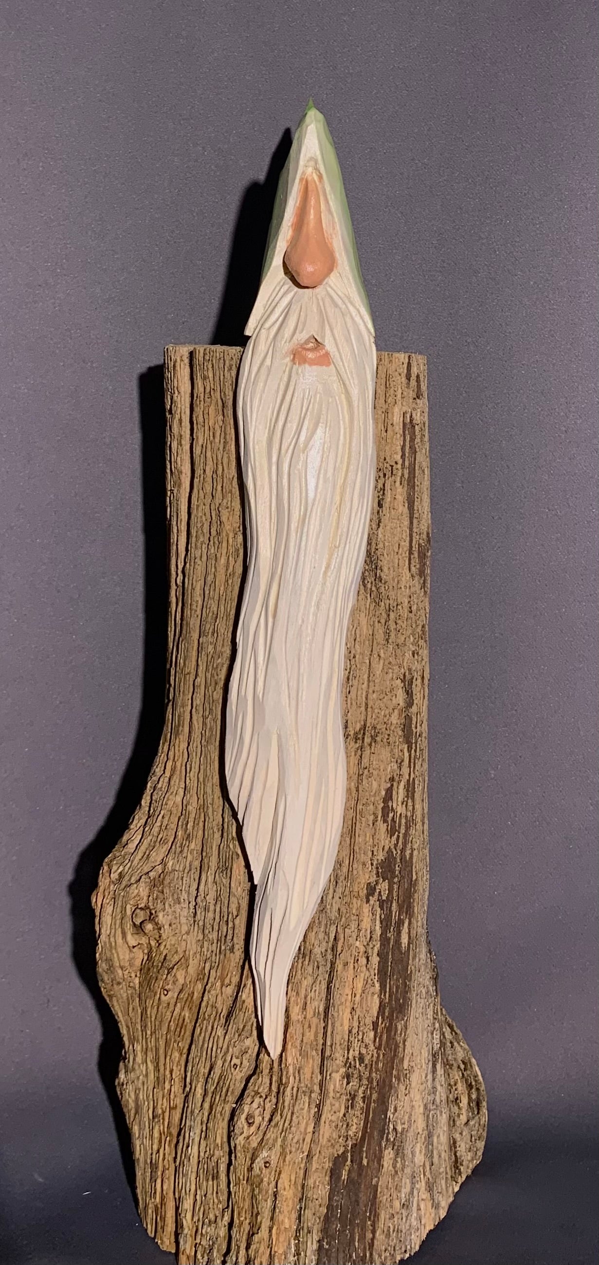 This shelf elf is hand-carved Basswood, stained in water base stain and painted with acrylic paint.
