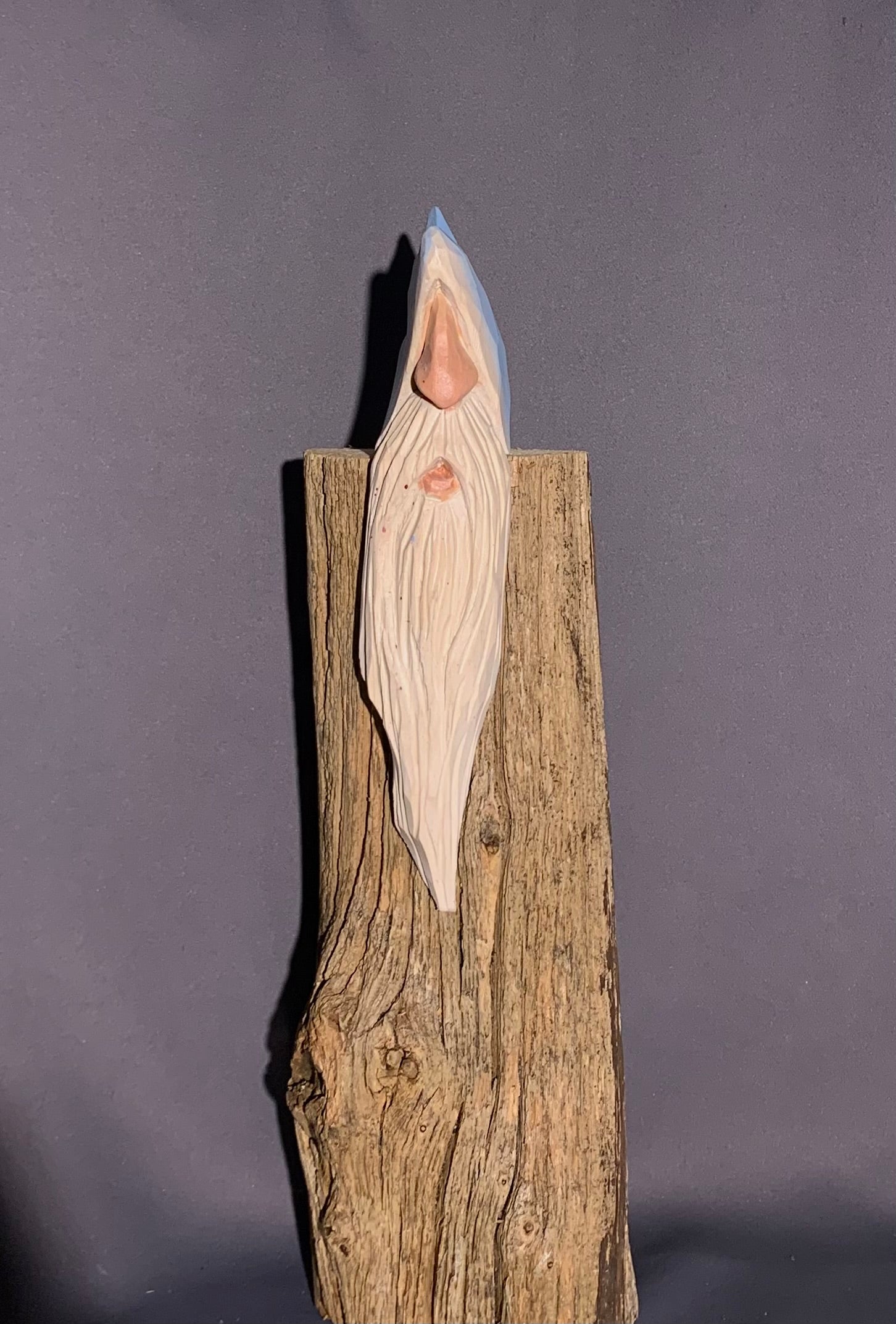 This shelf elf is hand-carved Basswood, stained in water base stain and painted with acrylic paint.