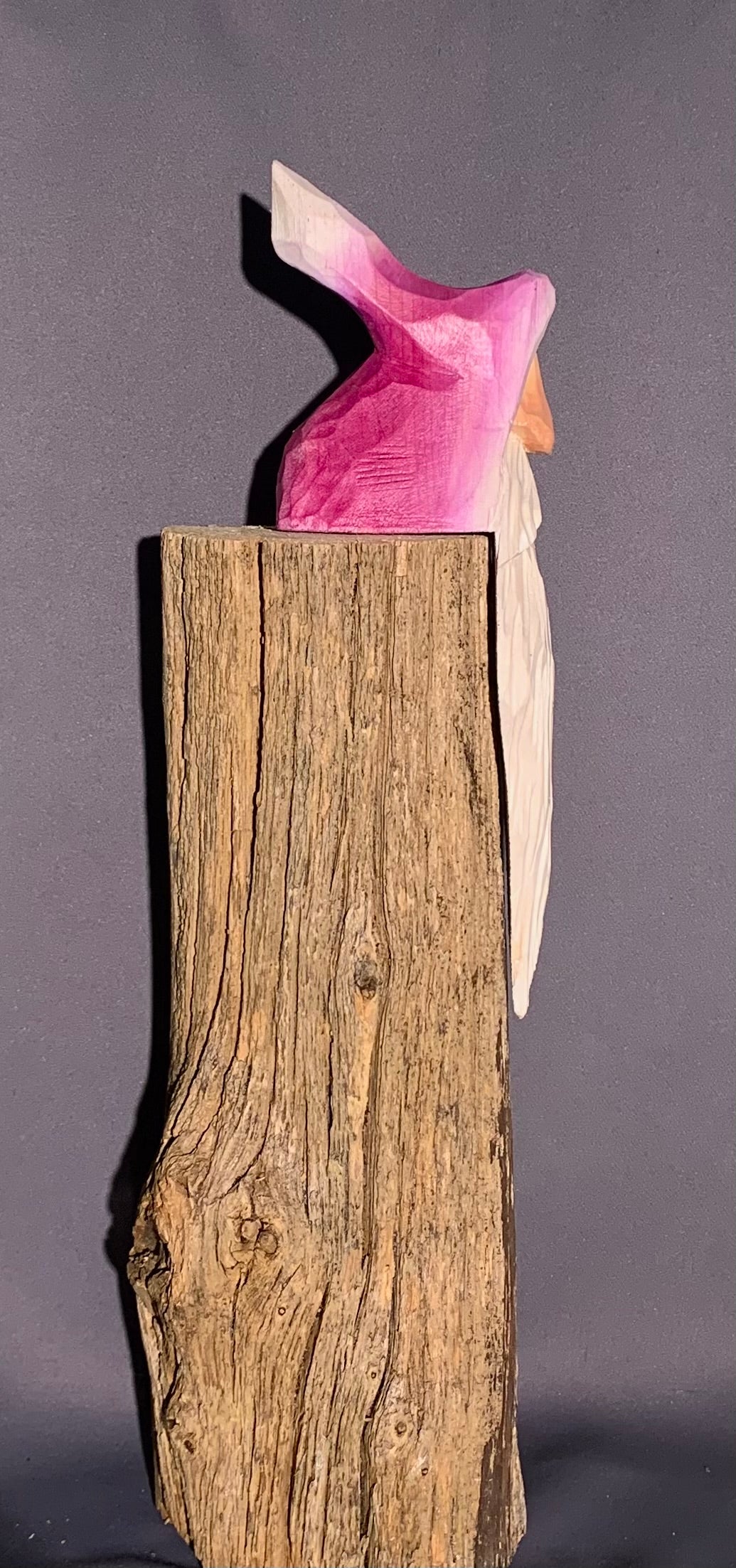 This shelf elf is hand-carved Basswood, stained in water base stain and painted with acrylic paint.