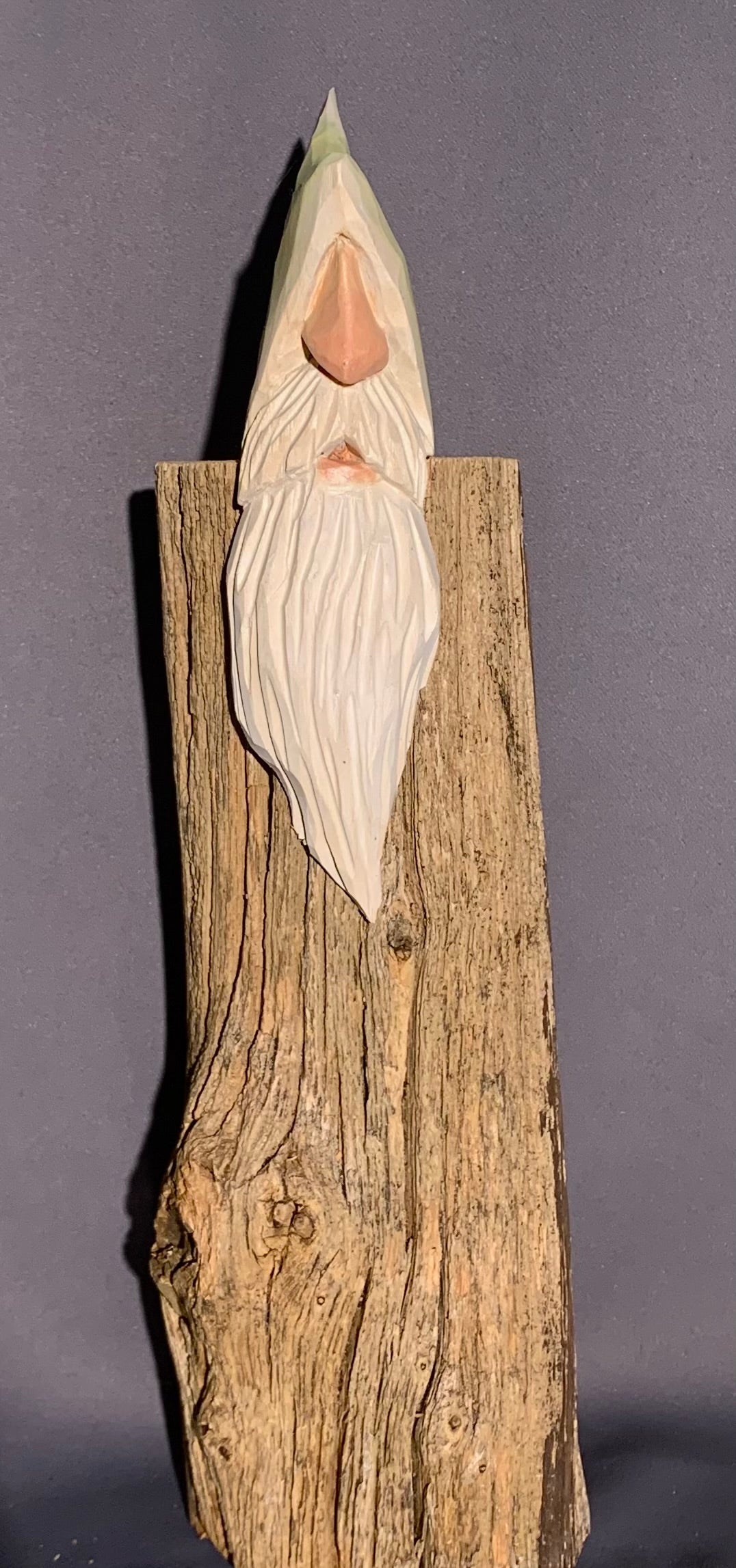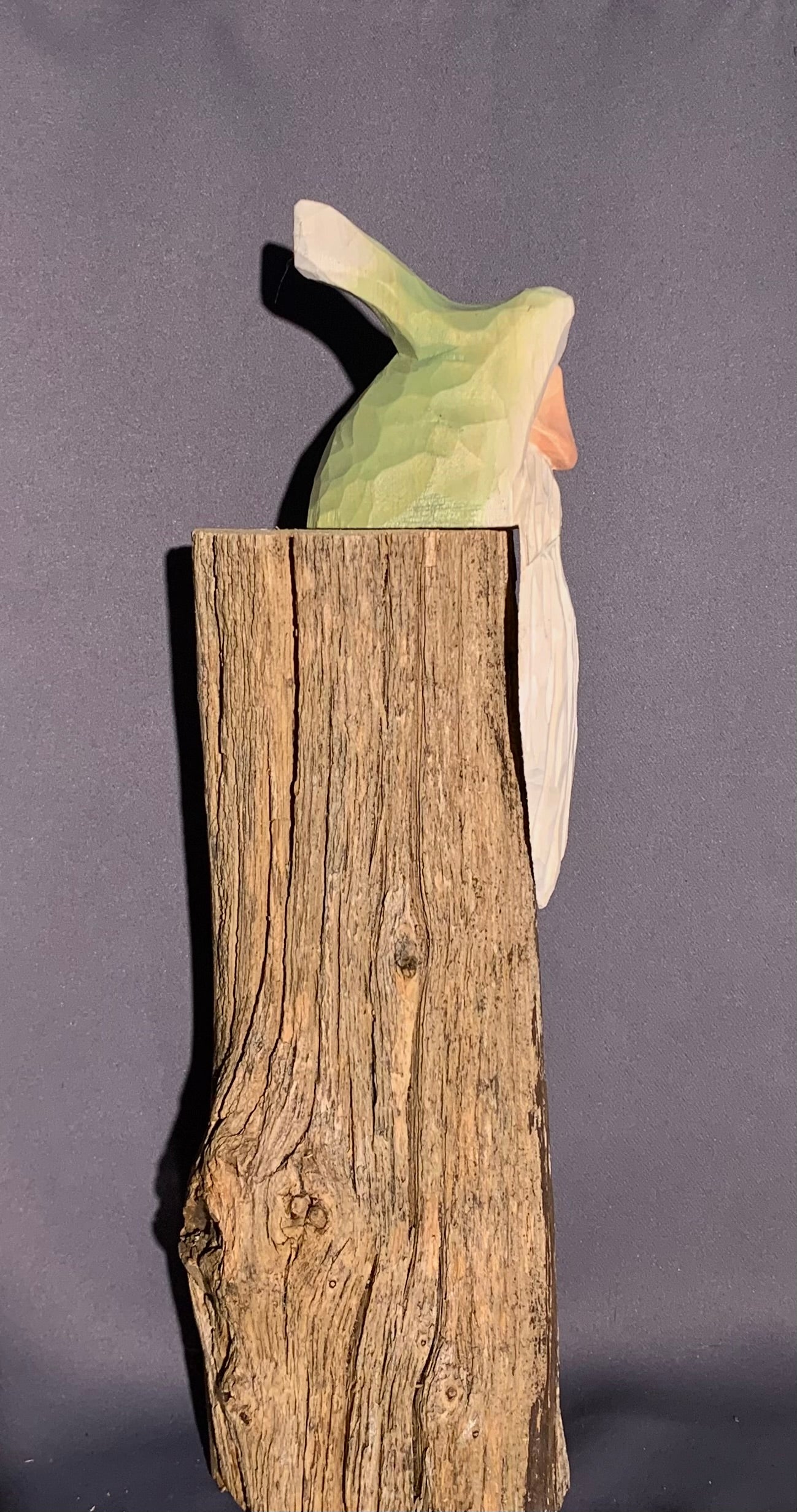 This shelf elf is hand-carved Basswood, stained in water base stain and painted with acrylic paint.