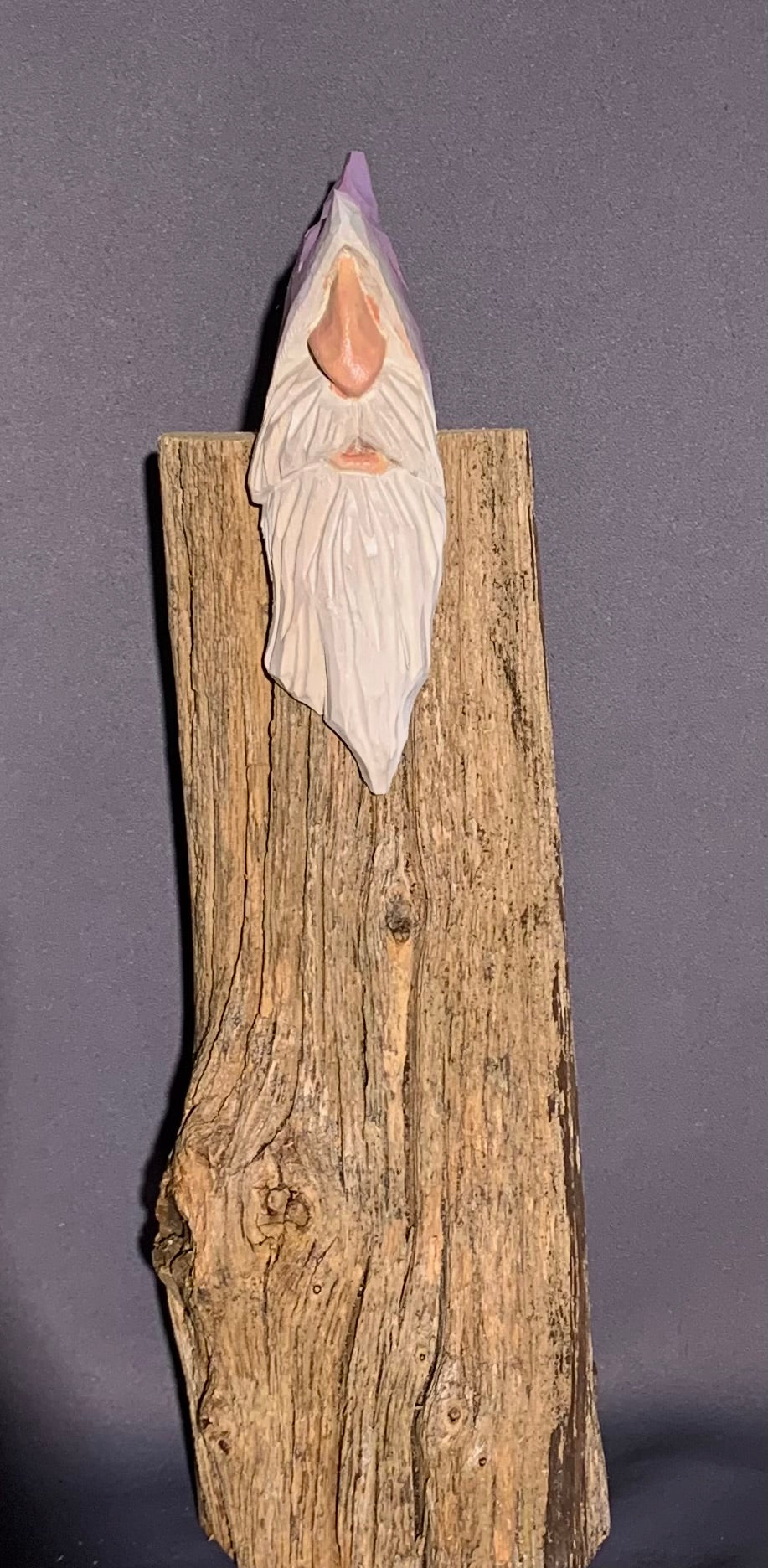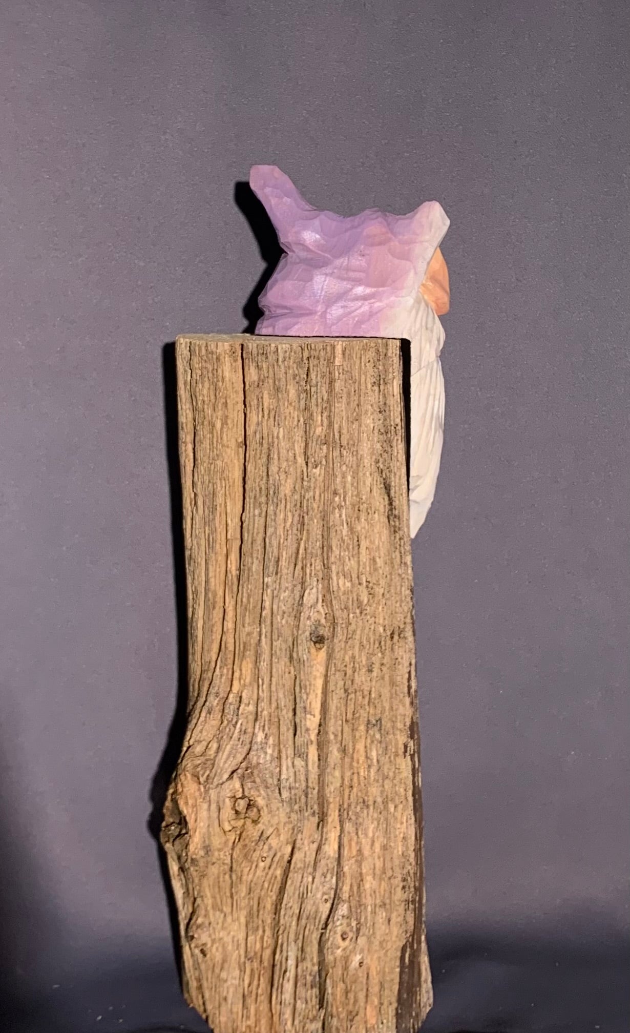 This shelf elf is hand-carved Basswood, stained in water base stain and painted with acrylic paint.