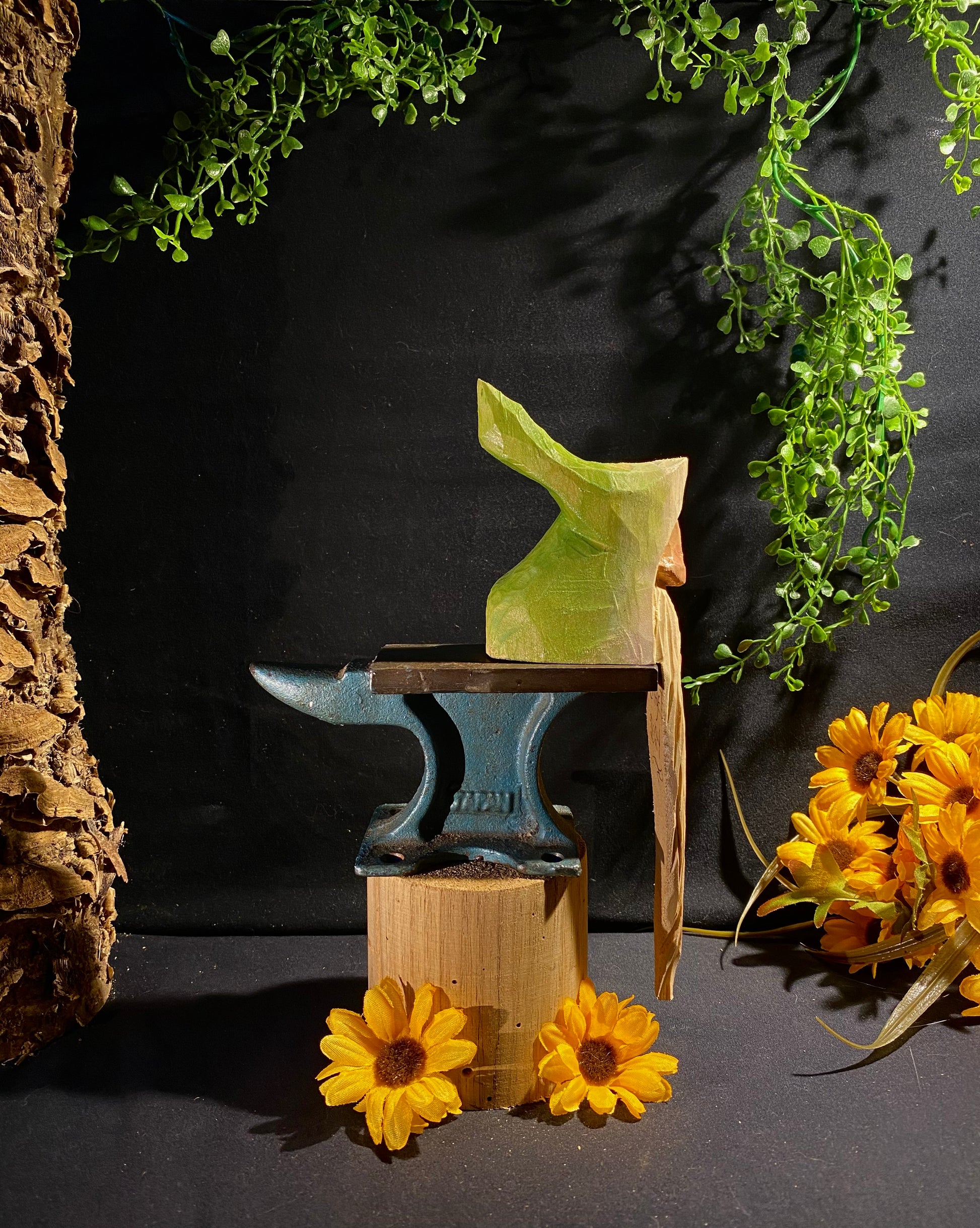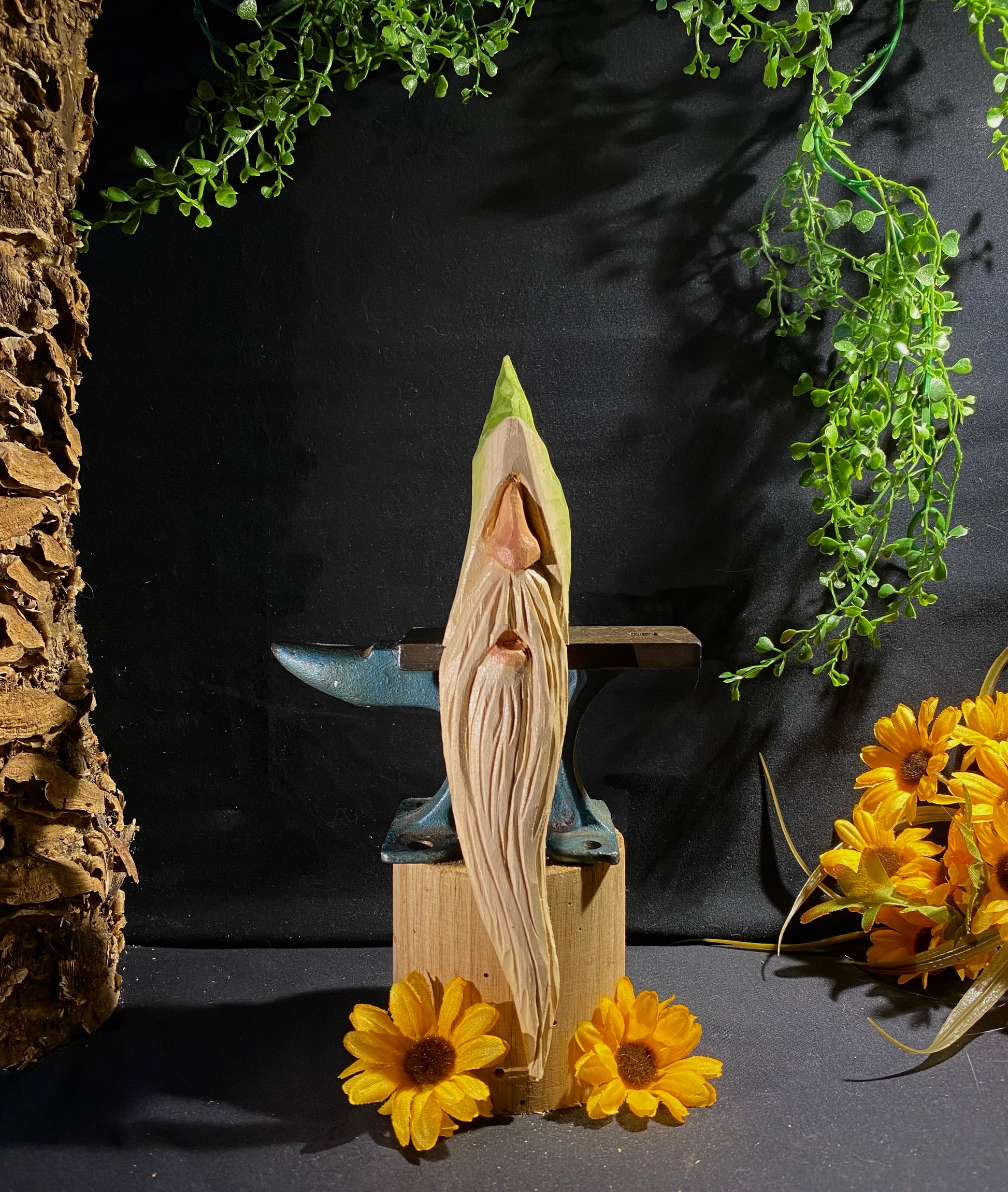 This shelf elf is hand-carved Basswood, stained in water base stain and painted with acrylic paint.