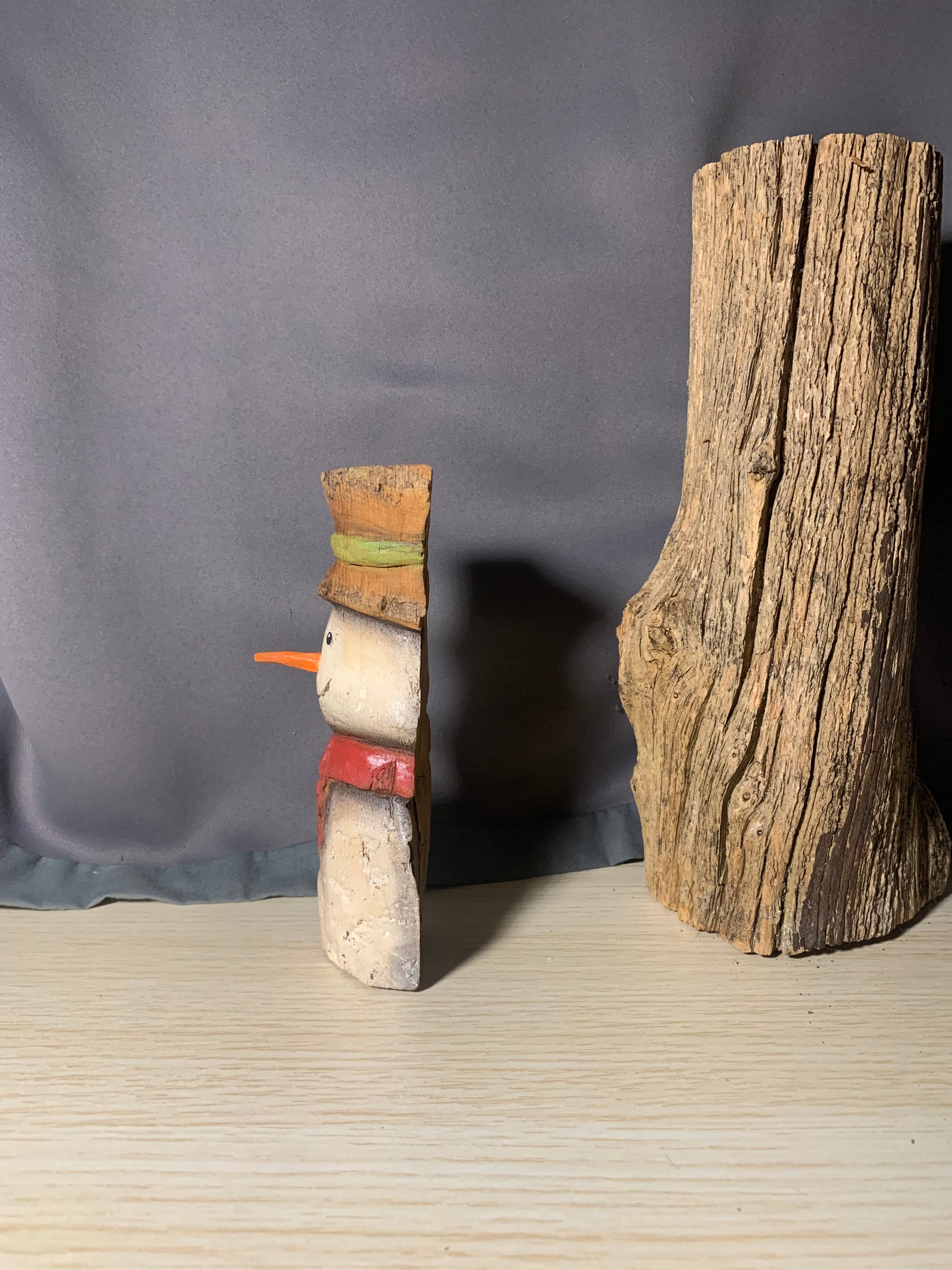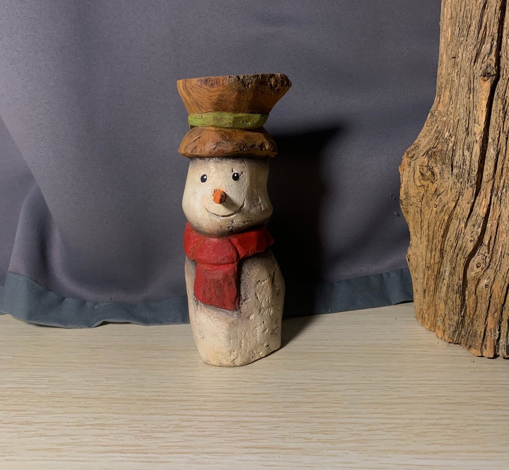 This Snowman is carved out of Eastern Cottonwood Bark, painted with acrylic paint and stained with water base oil.