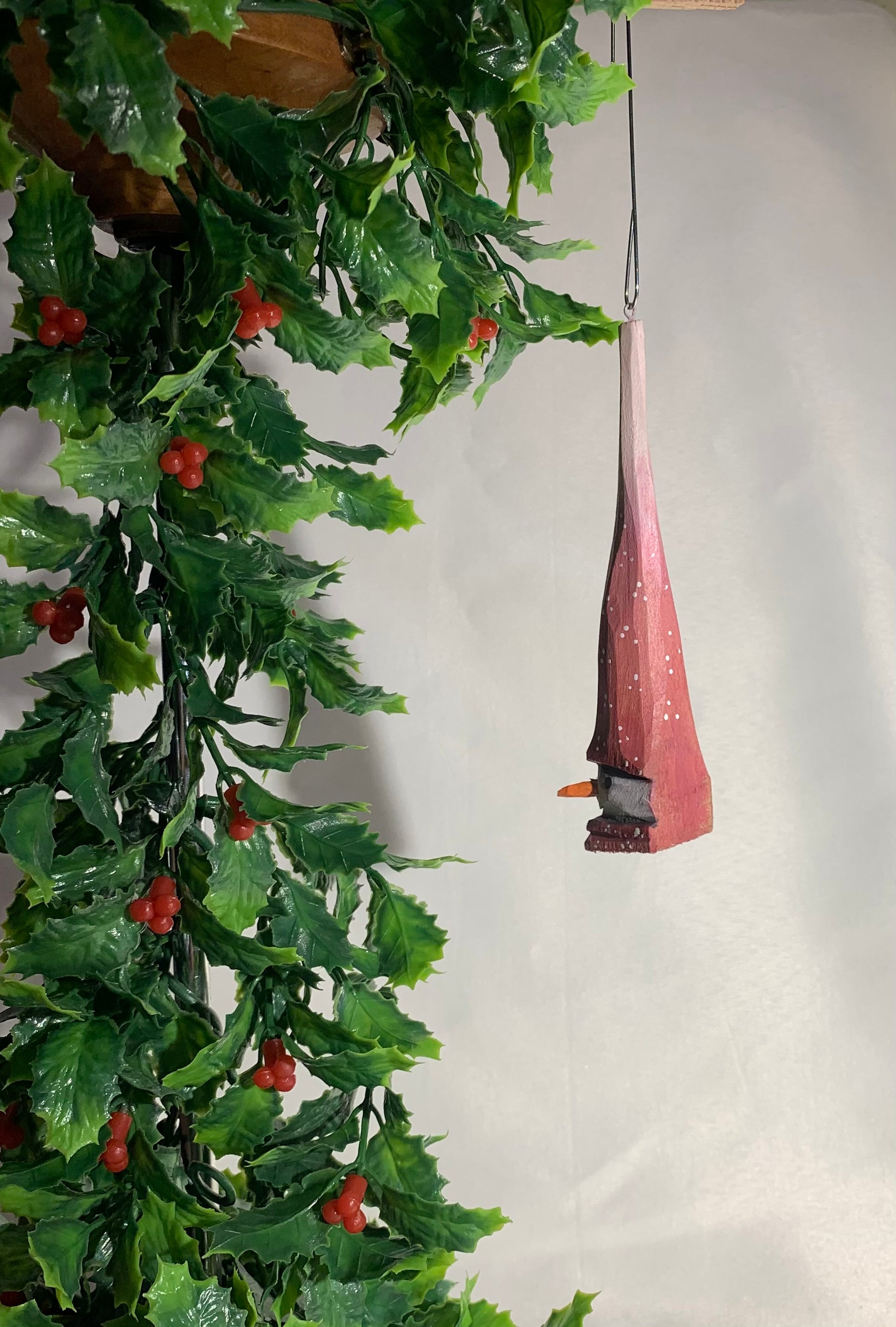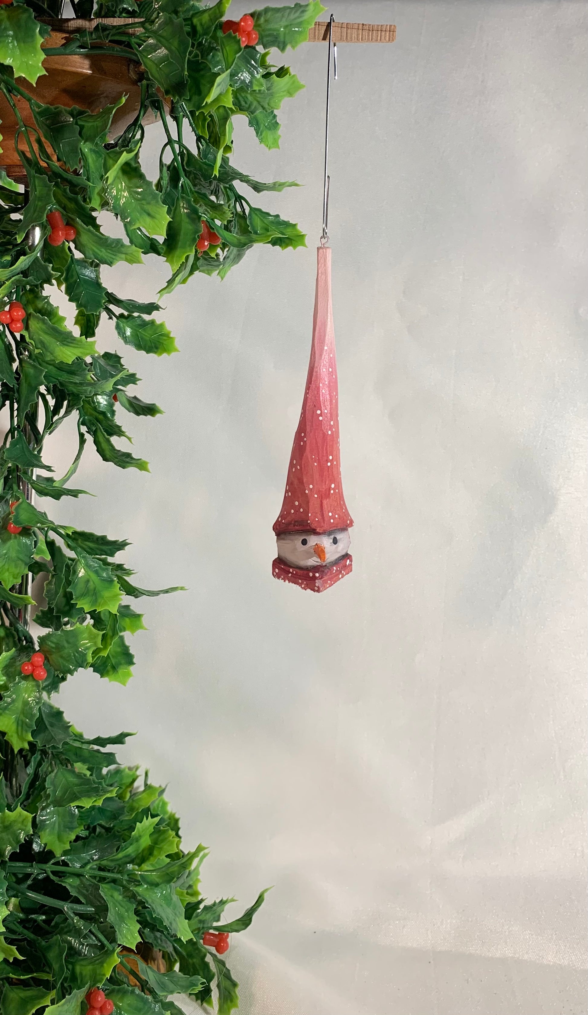 This Snowman Head Ornament is carved from Basswood, painted in acrylic paint and lightly stained with water-based stain for preserving the piece.