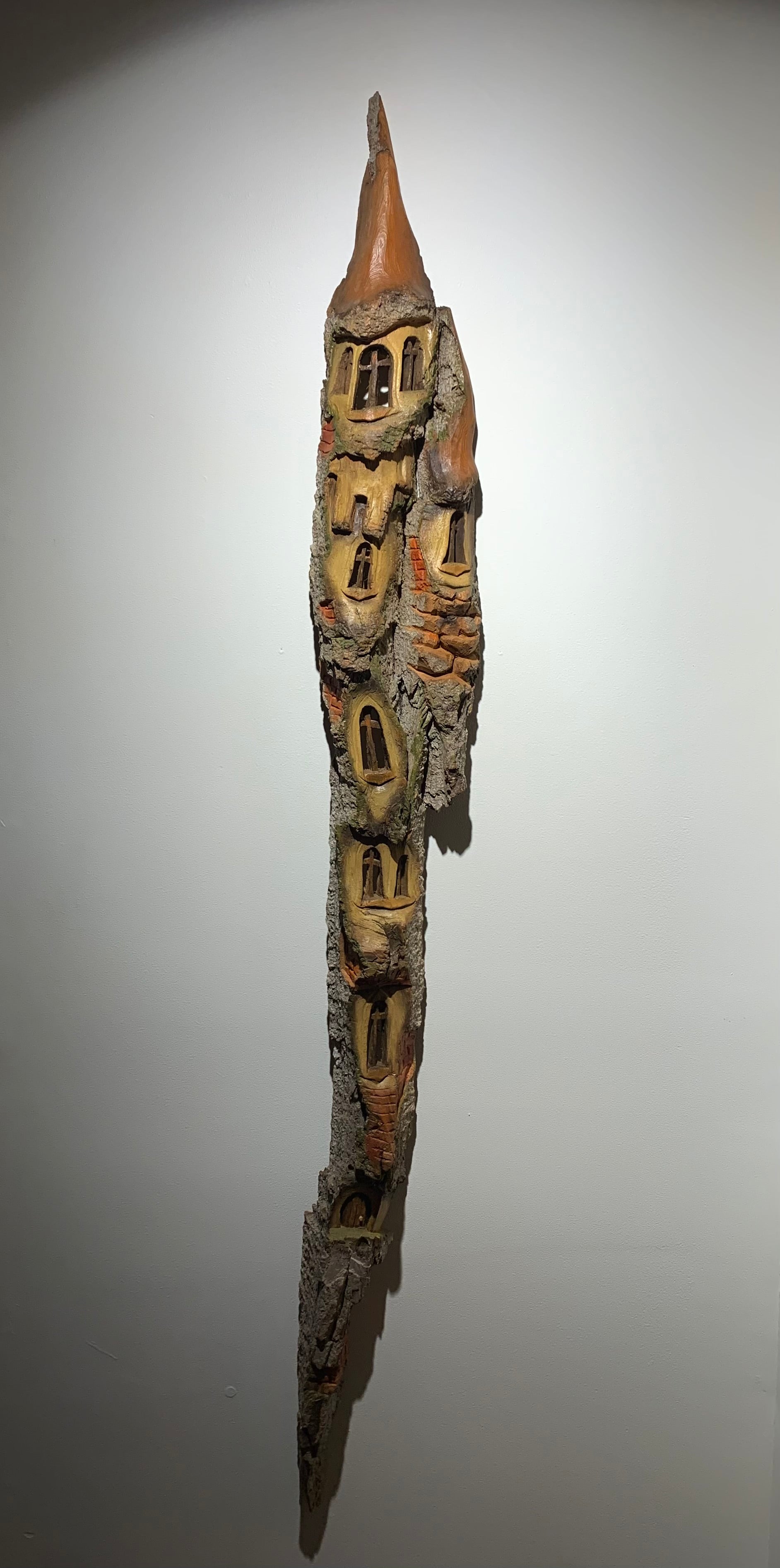 The artist has spent many days working with the natural shape of the bark to create a whimsical tower with an extremely unique look.