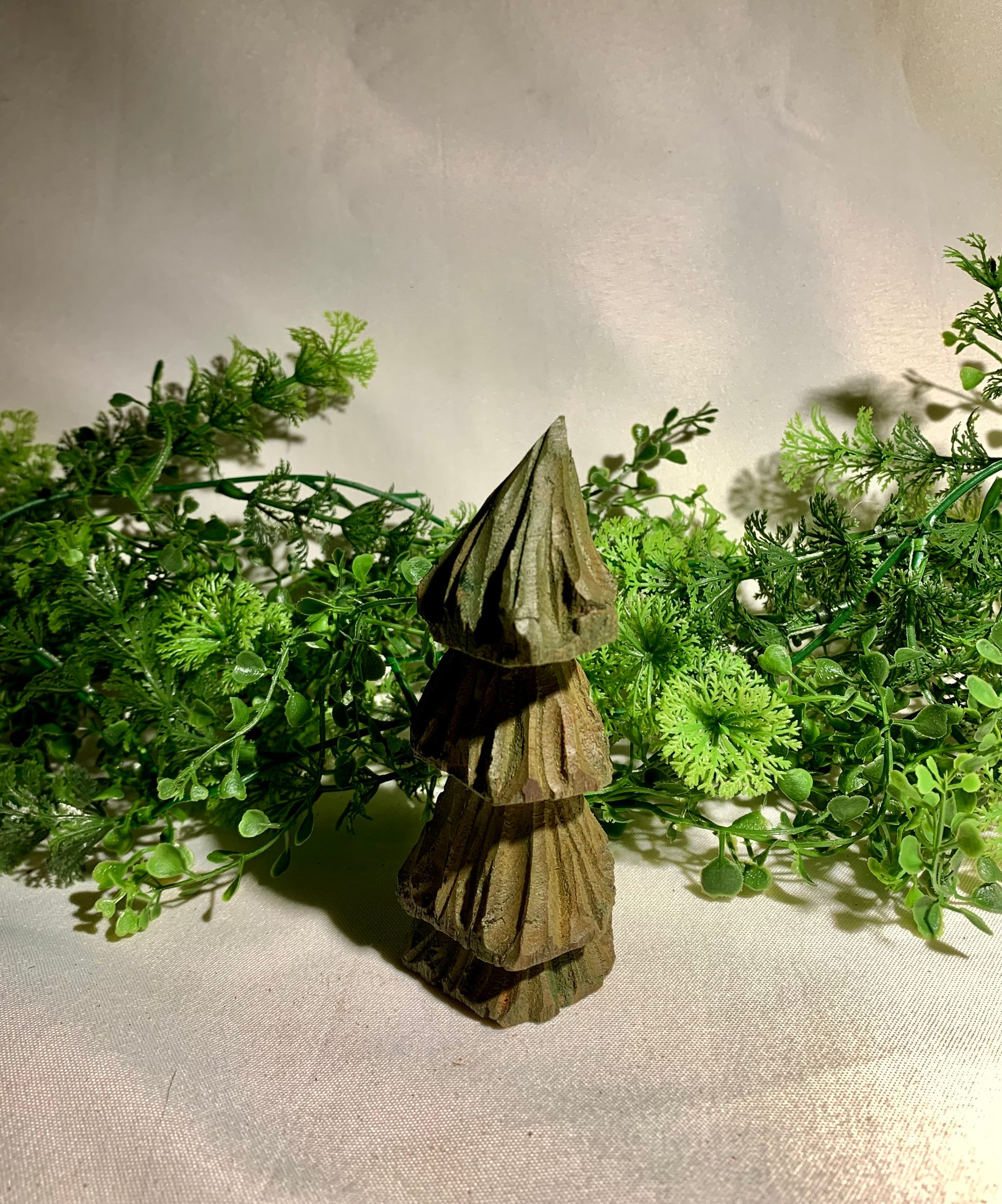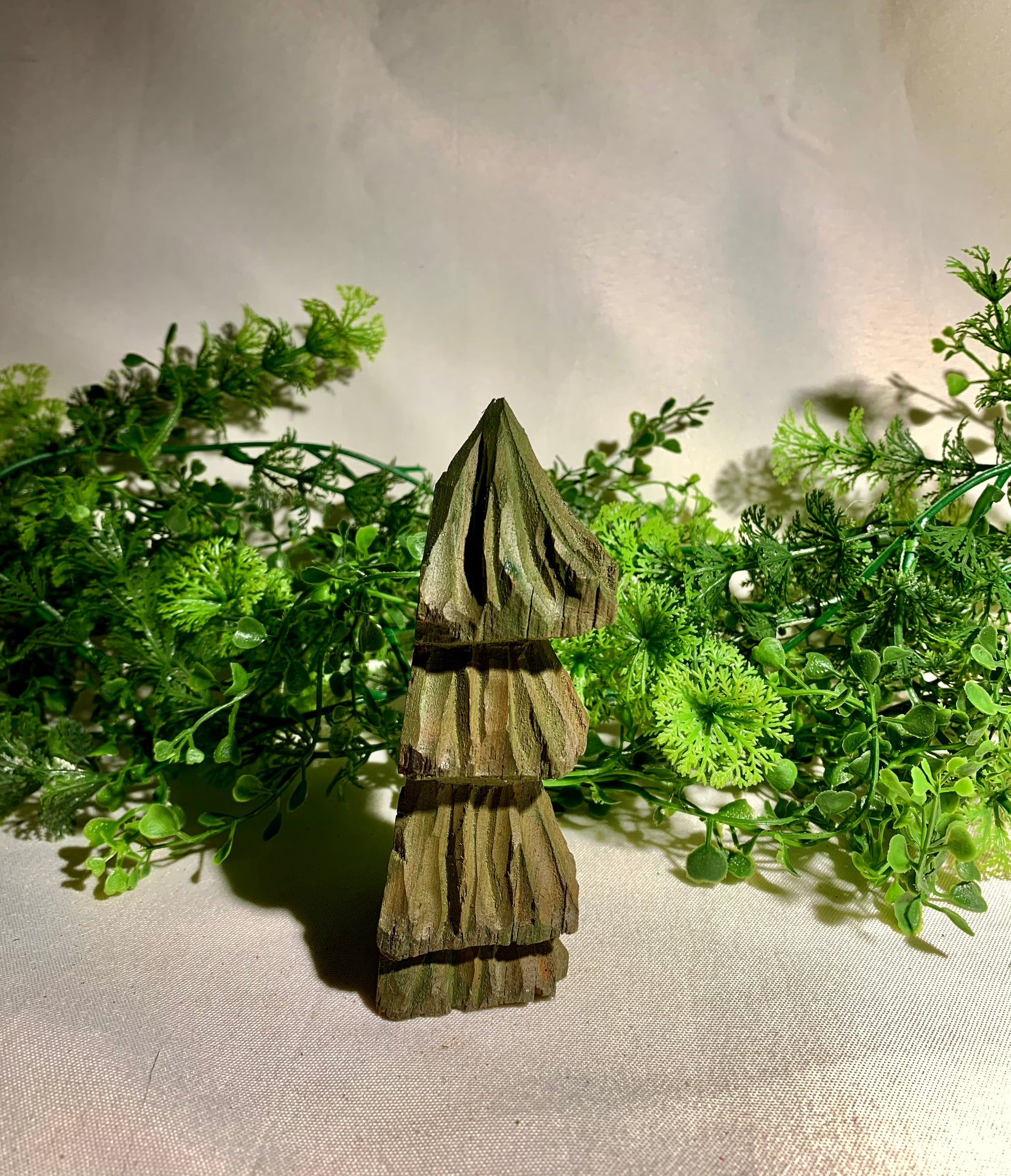 This tree is carved out of Eastern Cotton Wood Bark, coated in water base stain and painted with acrylic paint.